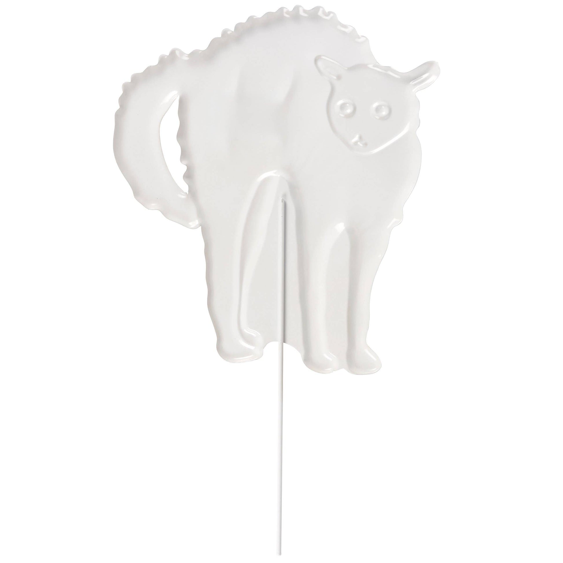 A metal garden pick from our Halloween Collection displaying a cutout of a black cat design with embossed details. Black cat design is replicated from original art hand painted in a delicate watercolor style. Our Black Cat garden pick includes a 6 inch stake to easily stand out in a garden or seasonal vessel. A charming Halloween home accent perfect for seasonal display.