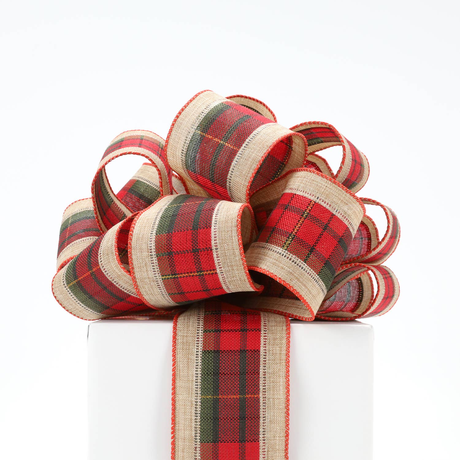 LA Ribbons Wholesale - 2 1/2" Burlap Holiday Wired Ribbon | "Plaid" Natural/Black/Red | 10 Yard Roll