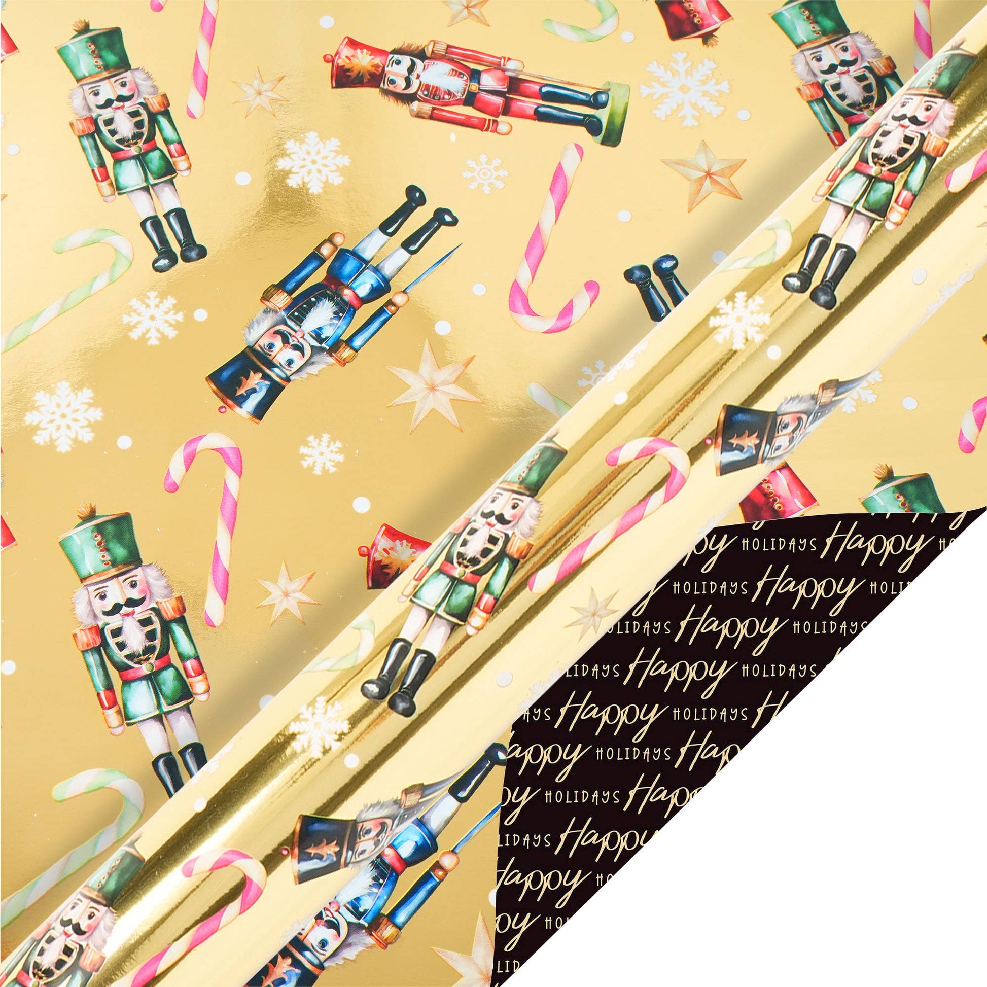 * Luxurious Metallic Finish: Features nutcracker, plaid, stripes, and script designs in bold red, gold, and black tones.