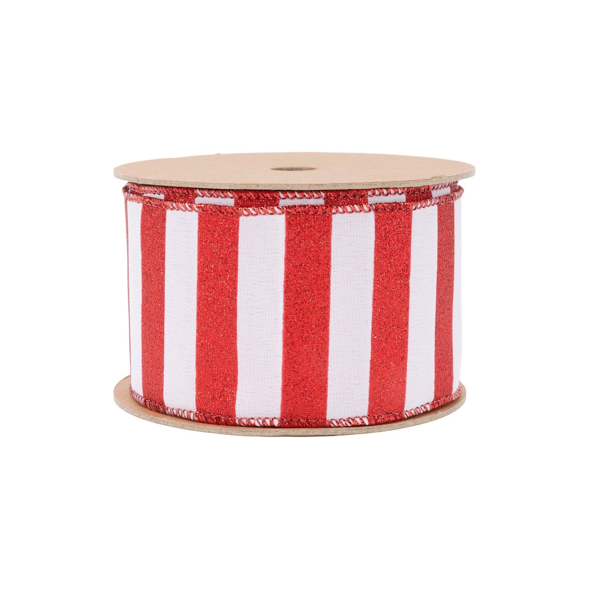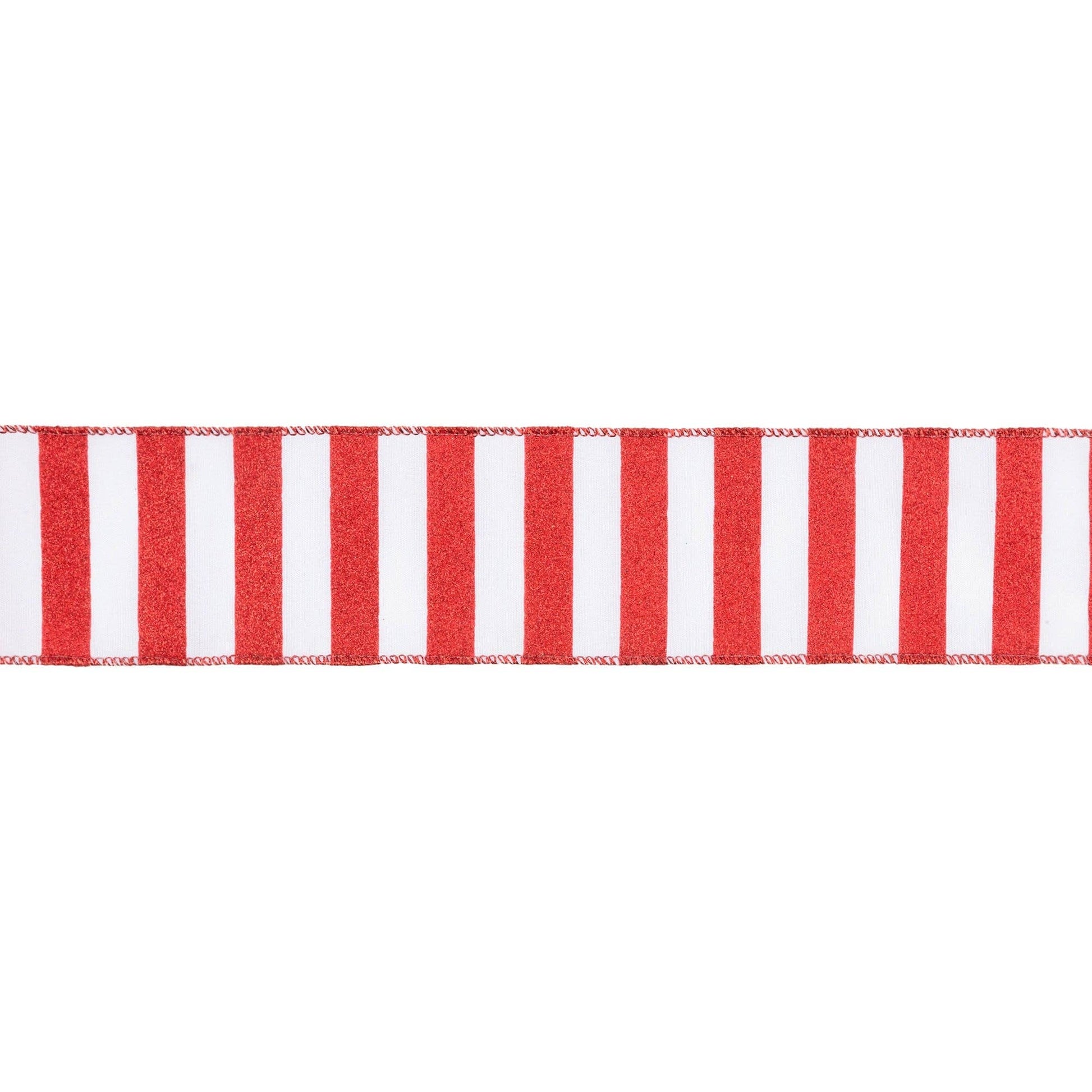 * Bold 2 1/2" white wired ribbon featuring glittered red horizontal stripes for a sparkling, festive touch.