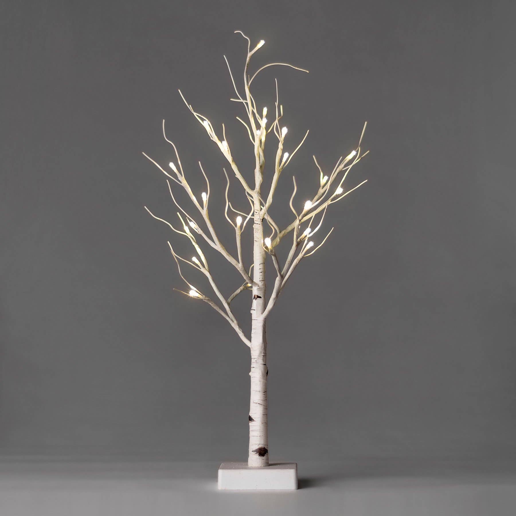 A stand-up lit birch twig decoration from our Decorative Lighting Collection stands 24" tall, contains 24 lights, 6-hour timer, takes 3 AA batteries (not included).