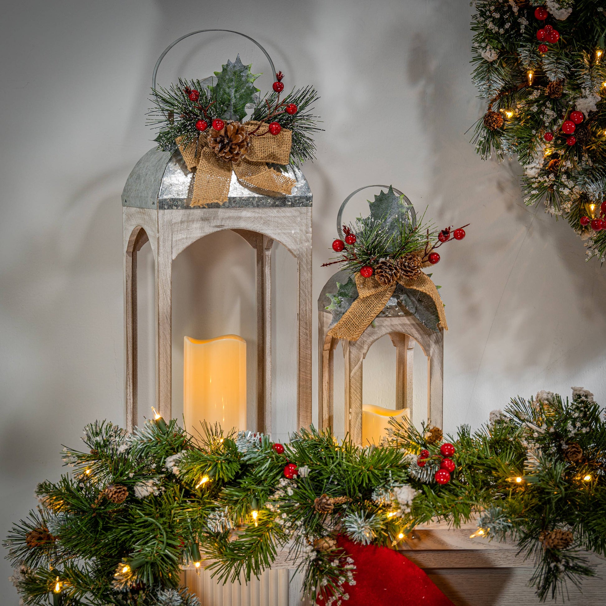 Perfect for adding rustic charm to your winter holiday decor, these lanterns are beautifully crafted with a distressed white finish, giving it that vintage farmhouse feel. In two sizes, this set allows you to create a lovely display in any room of your home. The LED candles provide a warm and cozy glow, while the pine accents and burlap bow add a touch of natural elegance. Use these lanterns to create a stunning centerpiece on your dining table or as a charming addition to your mantel. The versatile design makes it easy to incorporate into your existing holiday decor.